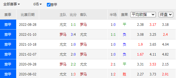 历史战绩:近6次交锋,罗马1胜2平3负。