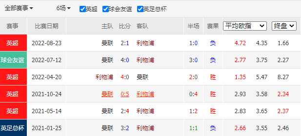 历史战绩:近6次交锋,利物浦3胜0平3负。