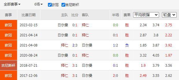 历史战绩:近6次交锋,拜仁慕尼黑5胜0平1负。