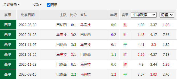 历史战绩:近6次交锋,马德里竞技4胜2平0负。