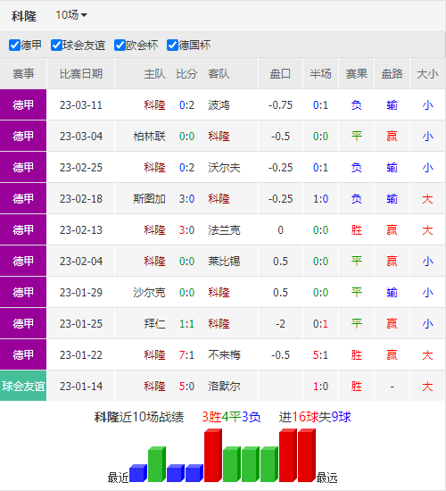 科隆暂时排在德甲第12位,领先降级区达到7分,但整体表现比起上赛季依然有所回落。球队本赛季的客场得分效率偏低,12仗过后只有1胜,幸而期间平局也有6场,把球队的客场战绩稳固在联赛中游。但近期科隆攻防两端都遭遇困境,在主场3球大胜法兰克福后,最近4轮联赛只有1平3负,并4场都被零封,却丢掉7球,在最近的7场比赛中,也有6场遭到零封。此外球队作客的攻击力也是相当羸弱,在最近的6个客场比赛只有1个进球,联赛至今的客场场均0.9个进球的数据,也是排在联赛倒数。