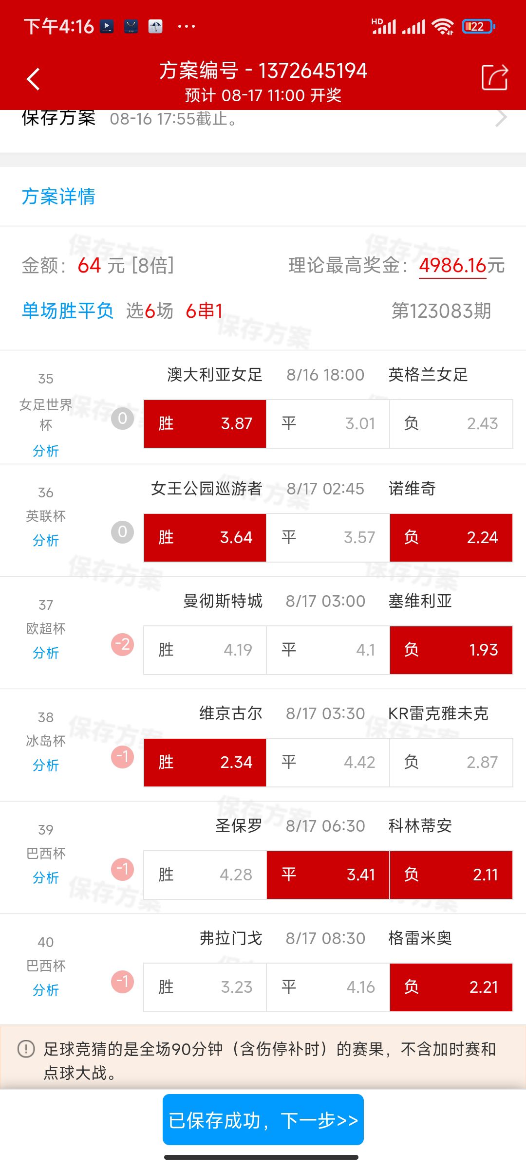 今天比赛少,6串送上,个人看法,红黑自判。