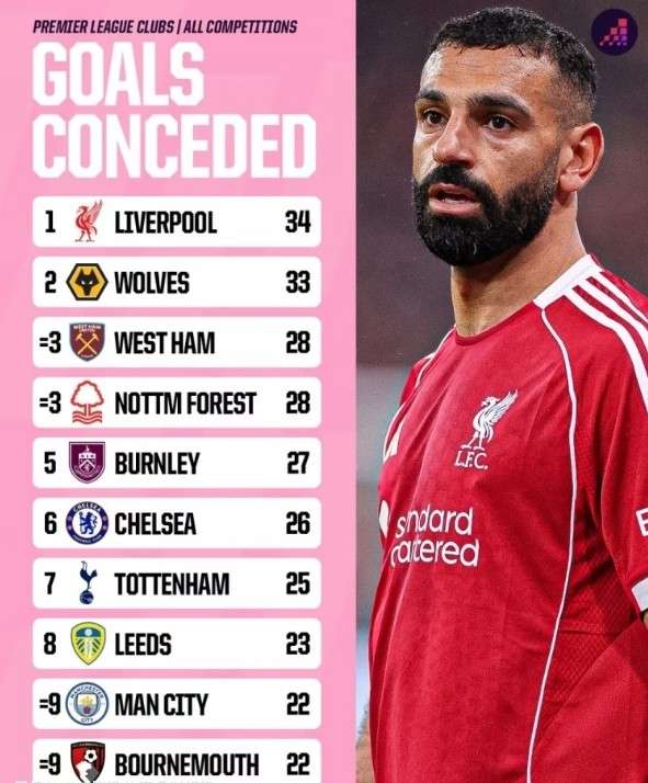 Opta统计英超球队总丢球数:利物浦34球最多 狼队、西汉姆紧随