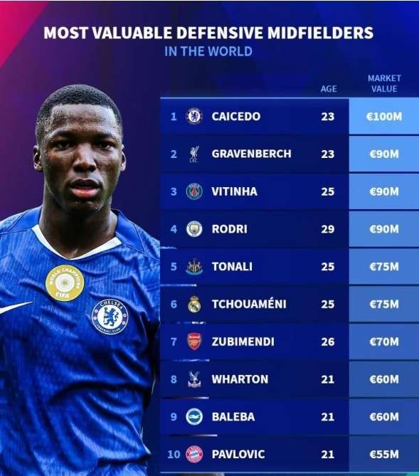 德转球员身价:防守中场凯塞多1亿居首 进攻型中场贝林厄姆1.8亿