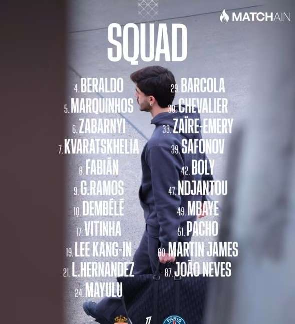 巴黎公布客战摩纳哥大名单:登贝莱领衔 门德斯、阿什拉夫等四人伤缺