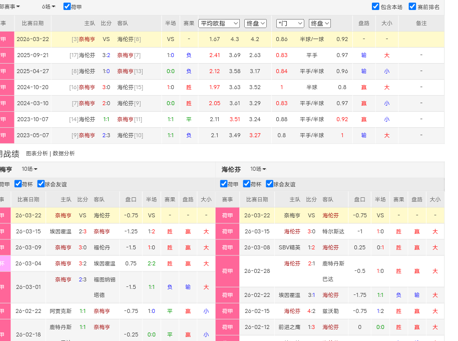 盘口过度向奈梅亨倾斜了,近期主客场连斩埃因,无视海伦芬近期三连胜