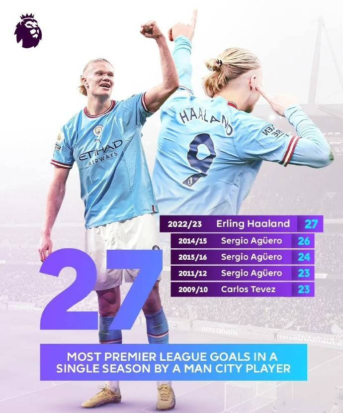 哈兰德24场27球 超越阿圭罗刷新曼城单赛季进球纪录
