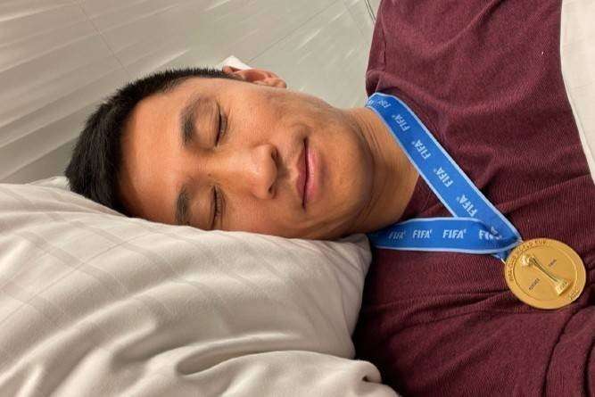 马宁社媒晒照:戴着世俱杯裁判纪念金牌一起睡觉