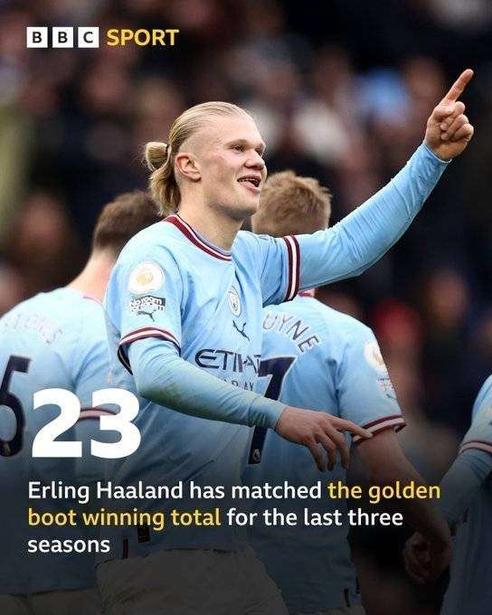 哈兰德联赛进球已达23粒 追平英超前三季金靴成绩