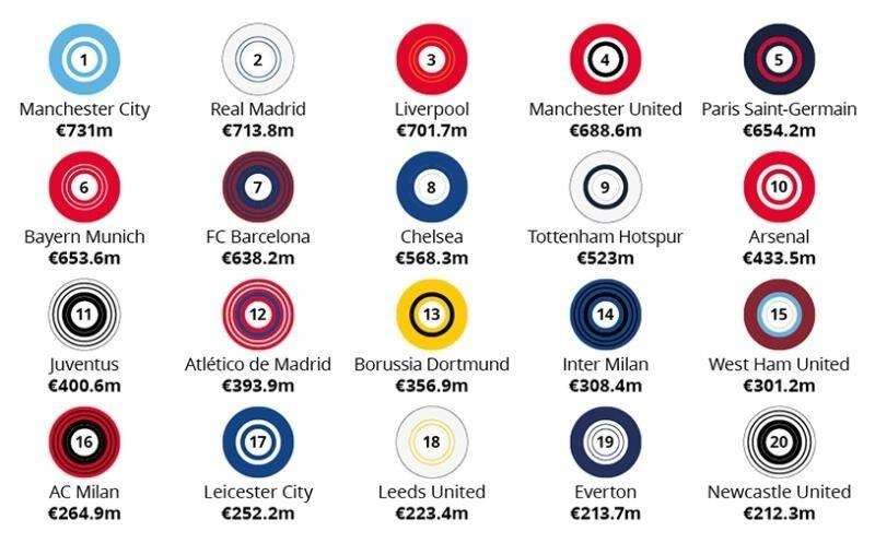 俱乐部年度收入排行:曼城蝉联榜首 英超6队排名前10位