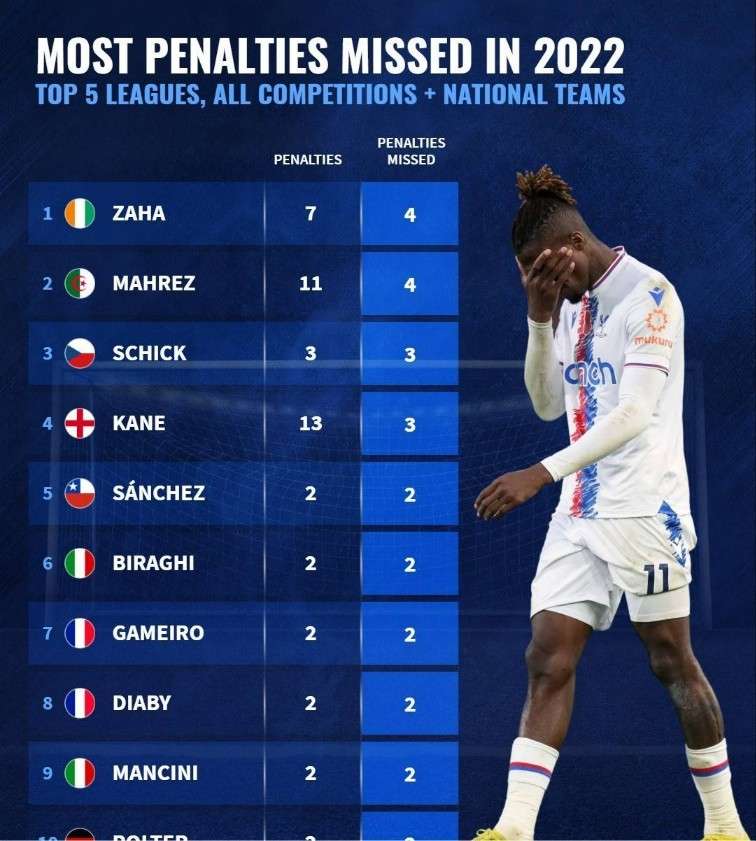 2022年五大联赛球员失点数排名:扎哈、马赫雷斯4球并列最多