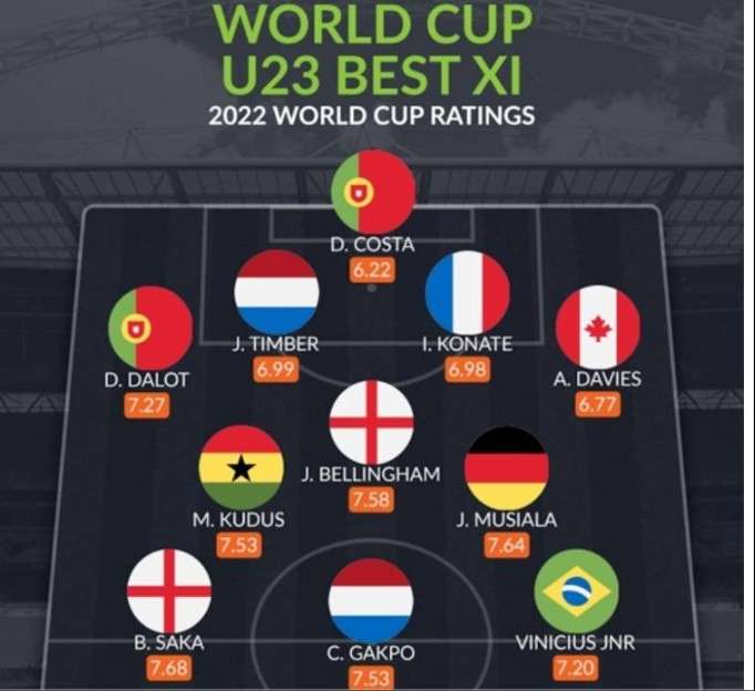 外媒评世界杯U23最佳阵容:英荷葡各两名球员入选