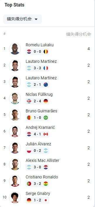 世界杯单场错失机会排名:卢卡库位居榜首 劳塔罗紧随其后