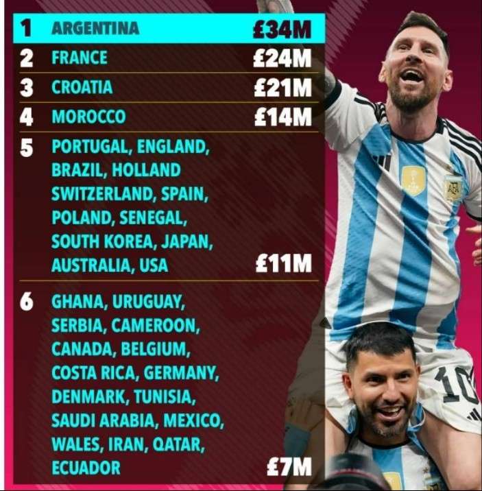 冠军阿根廷获3450万英镑 比上届多出300万英镑