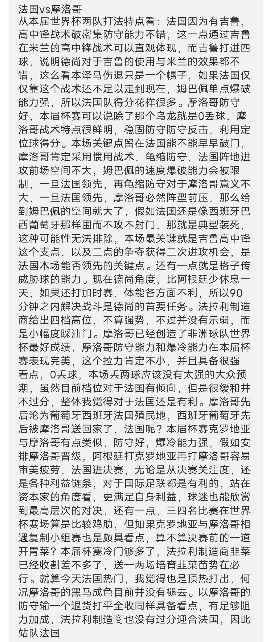 从赛果来看,法国摩洛哥这场多角度分析还算完美。本届世界杯不能过分
