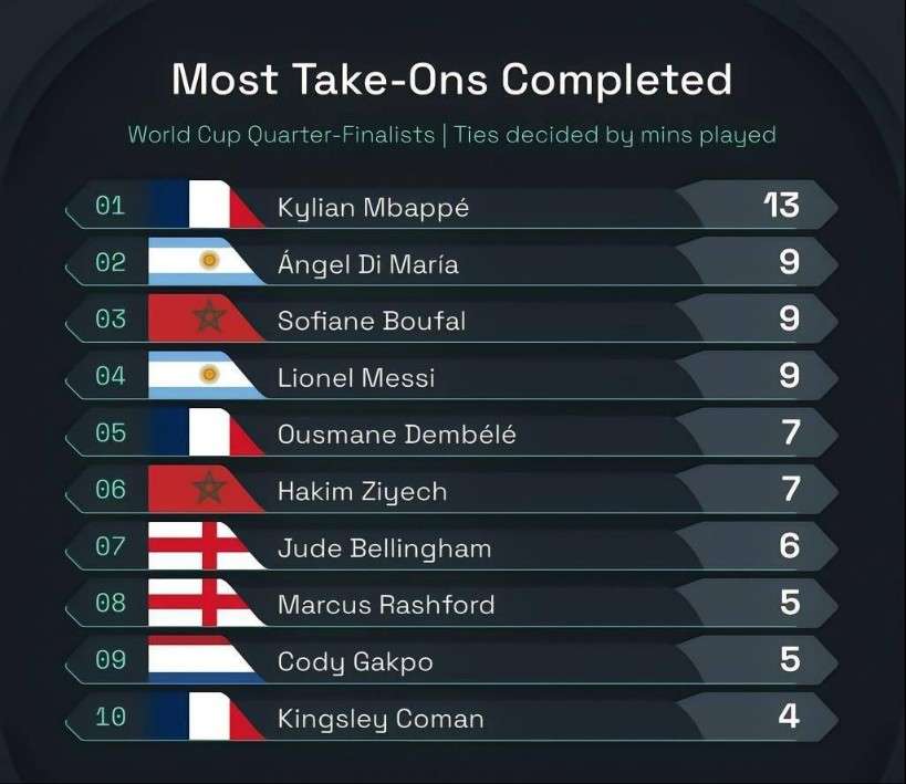 八强球员世界杯成功过人次数:姆巴佩13次居首 梅西第二