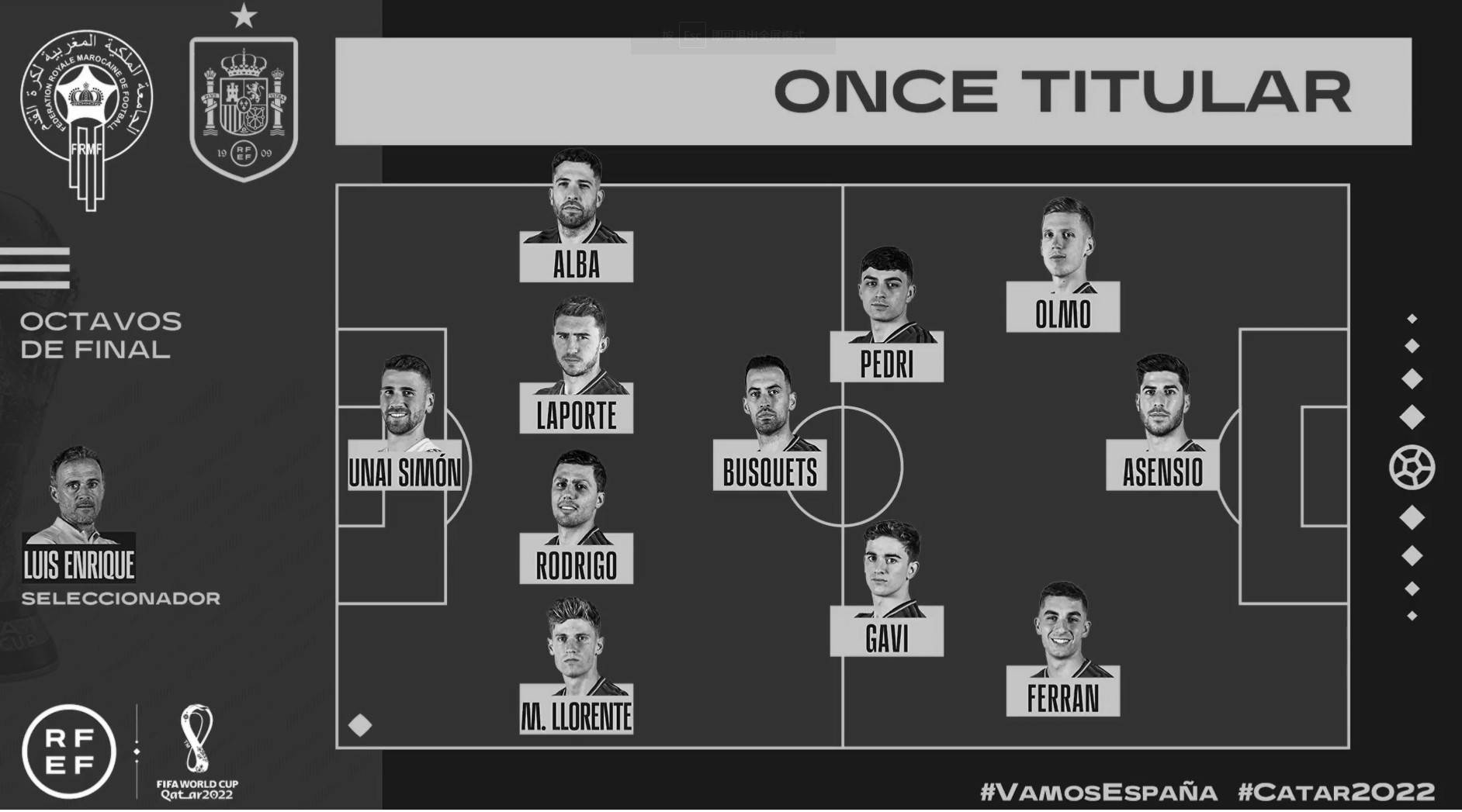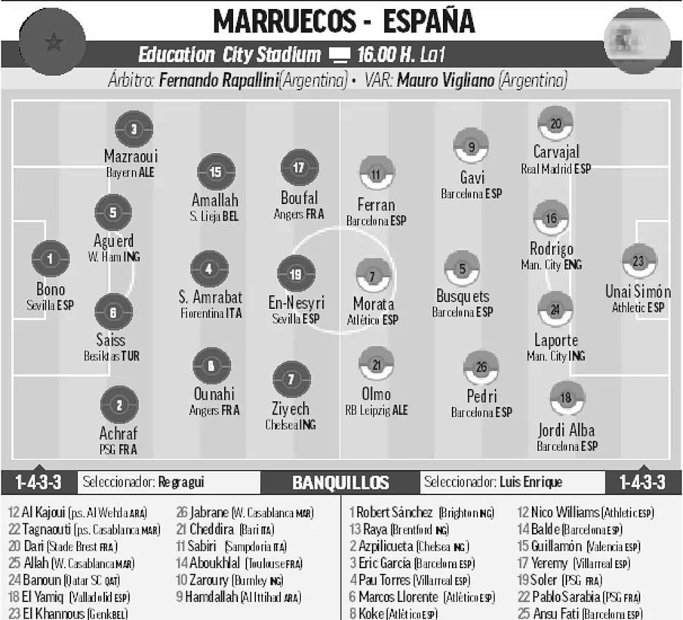 摩洛哥vs西班牙首发:恩内斯里PK费兰 佩德里、略伦特先发