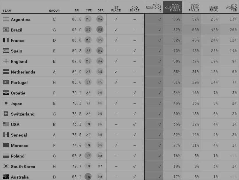 16强各队晋级概率:阿根廷、巴西领跑 澳大利亚垫底