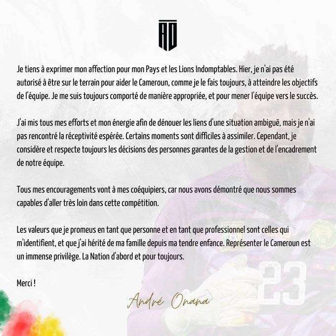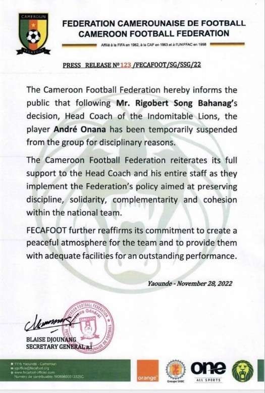 喀麦隆官方:奥纳纳因纪律原因被队内禁赛