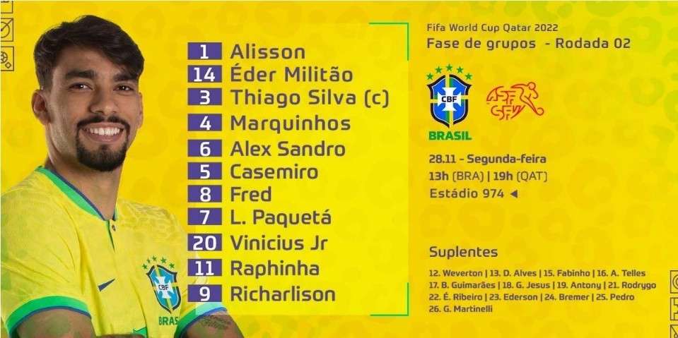 巴西vs瑞士首发:理查利森、维尼修斯领衔 内马尔缺战