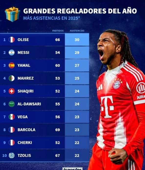 德转2025年俱乐部+国家队助攻榜:奥利塞30次居首 梅西29次