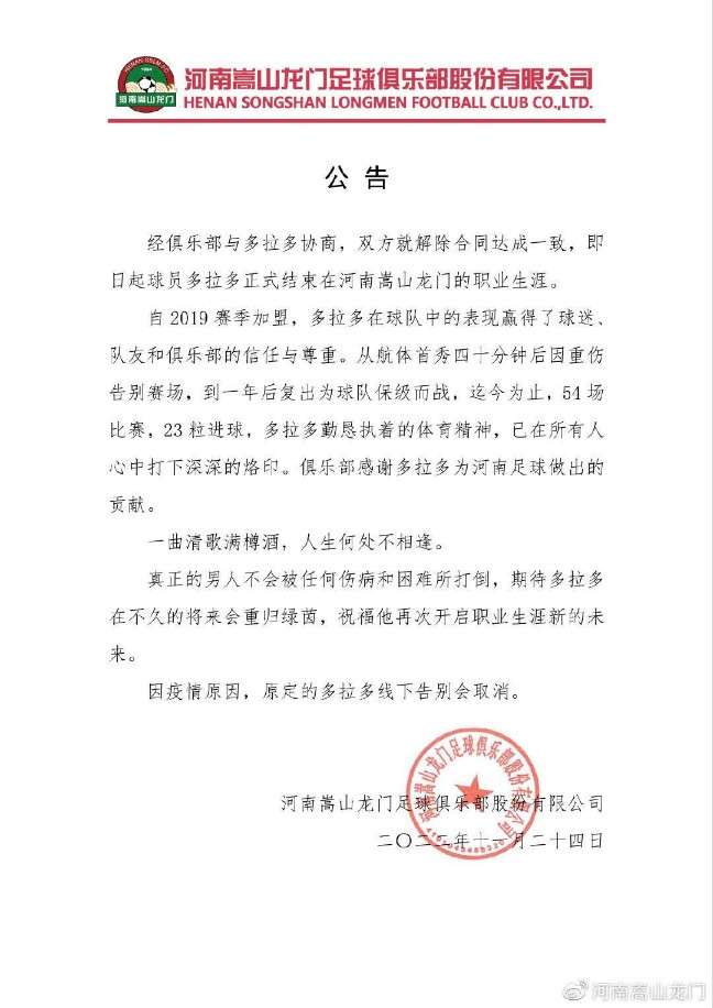 河南嵩山龙门官方:经双方协商 与外援多拉多解约