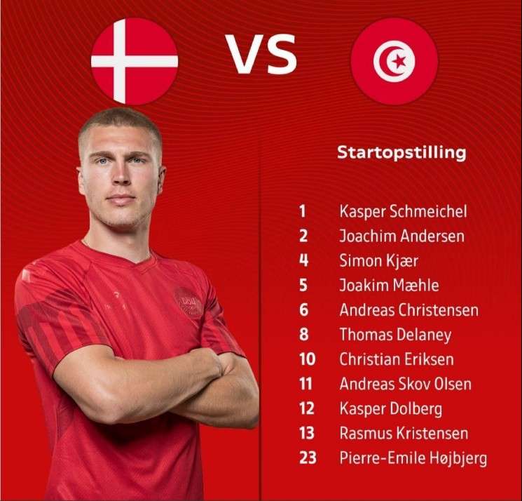 丹麦vs突尼斯首发:埃里克森领衔 克亚尔、霍伊别尔出战