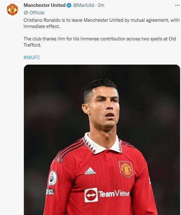 记者:C罗与曼联解约 自愿放弃了剩余1600万镑薪资