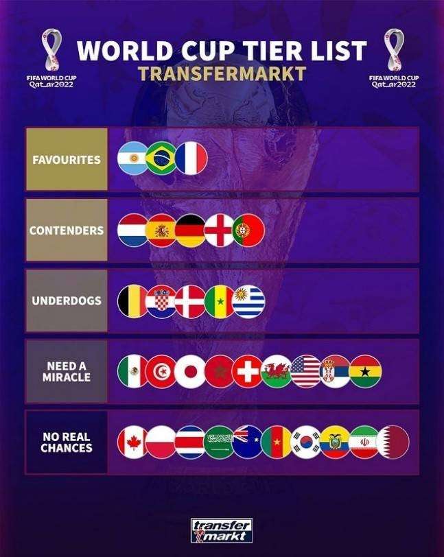 德转预测世界杯夺冠分档:巴阿法第一档 荷西德英葡第二档