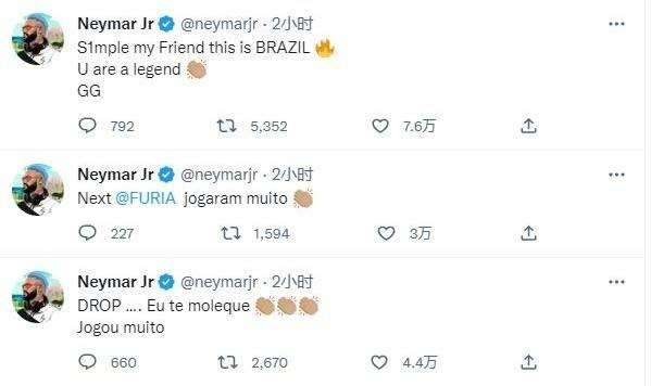 内马尔连发多条推文祝贺巴西战队Furia