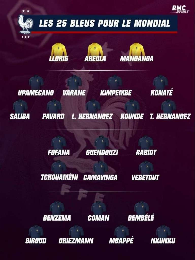 法国世界杯25人大名单:本泽马、姆巴佩领衔 瓦拉内、吉鲁入选