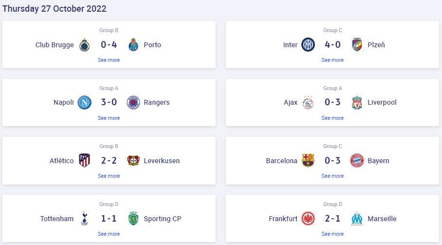 欧冠第5轮第二比赛日延续进攻火力 8场比赛贡献26球