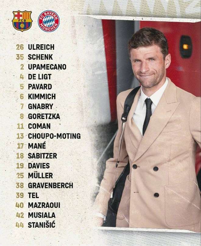 拜仁欧冠大战巴萨名单:马内、穆勒领衔 诺伊尔、萨内缺阵