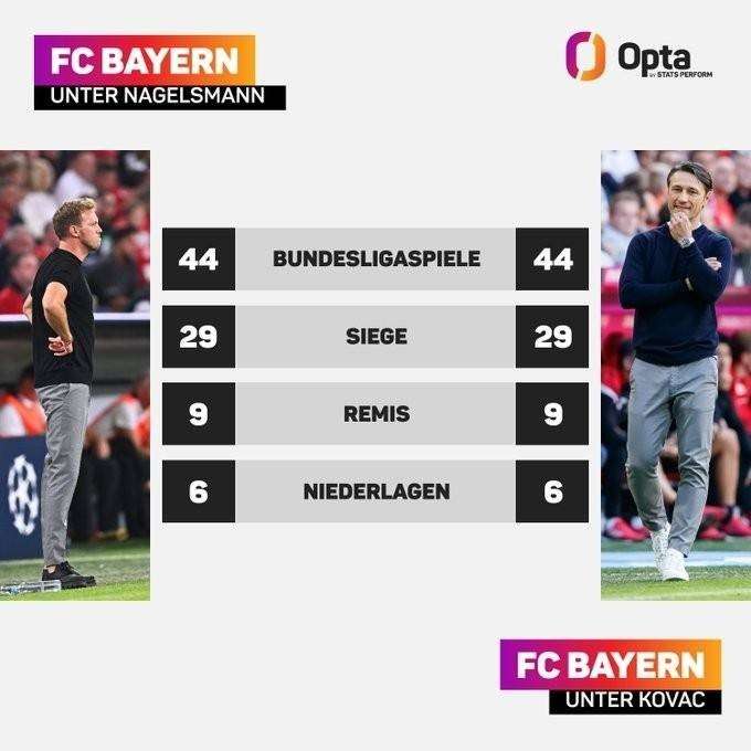 纳帅执教拜仁前44场德甲战绩与前任科瓦奇如出一辙