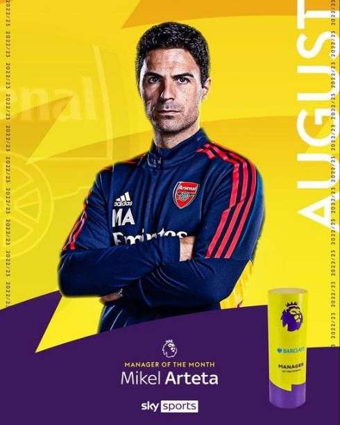 官方:阿森纳主帅阿尔特塔当选英超8月最佳教练