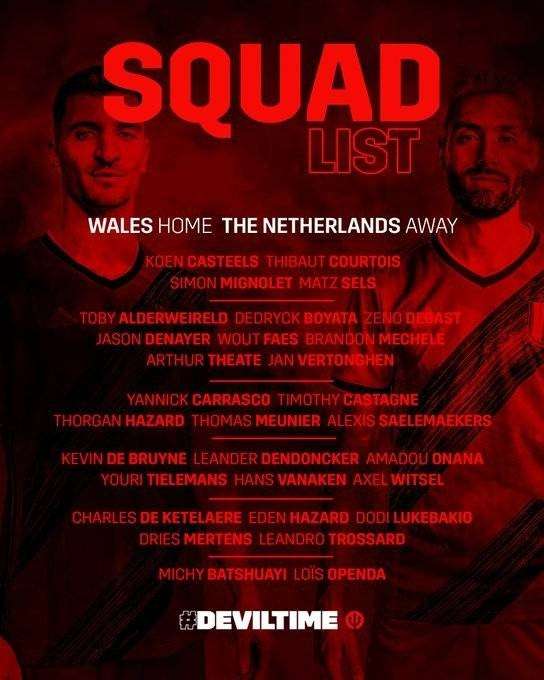 比利时最新一期大名单:德布劳内领衔 卢卡库伤缺