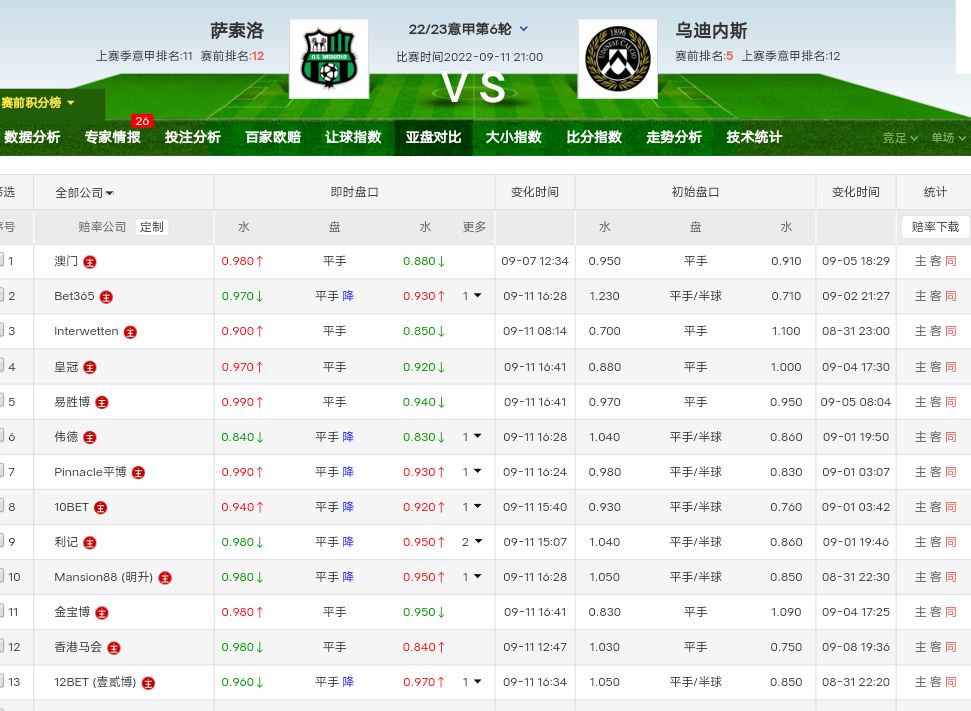 竞猜7010 意甲 萨索洛 VS 乌迪内斯