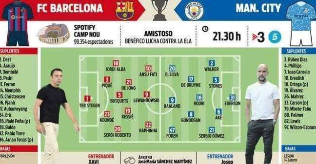 巴萨和曼城的友谊赛将以全主力出战 莱万、哈兰德均会首发