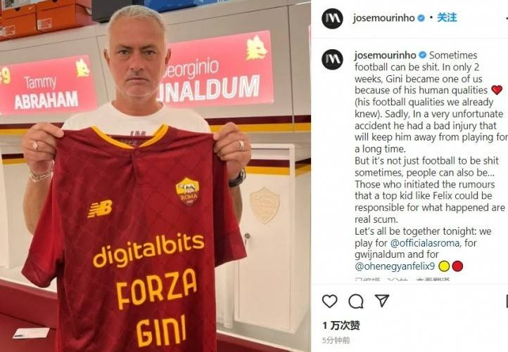 穆里尼奥社媒辟谣小吉安铲伤维纳尔杜姆传闻:今夜为罗马而战!