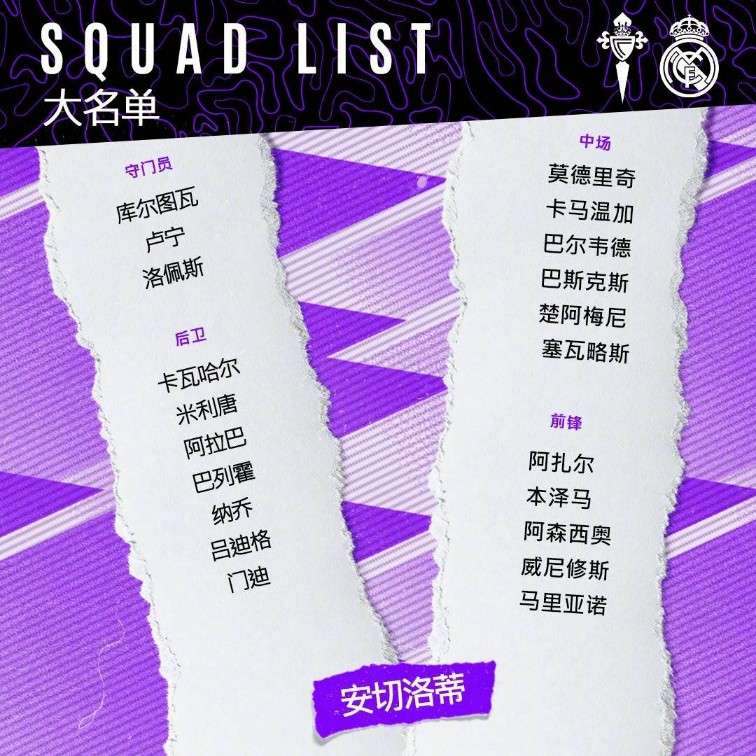 皇马VS塞尔塔大名单:本泽马领衔 卡塞米罗、克罗斯无缘