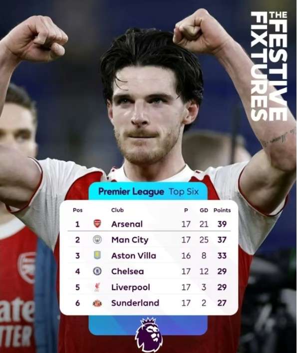 这次枪手如何?英超时代此前33个圣诞冠军有17次最终夺冠 概率为