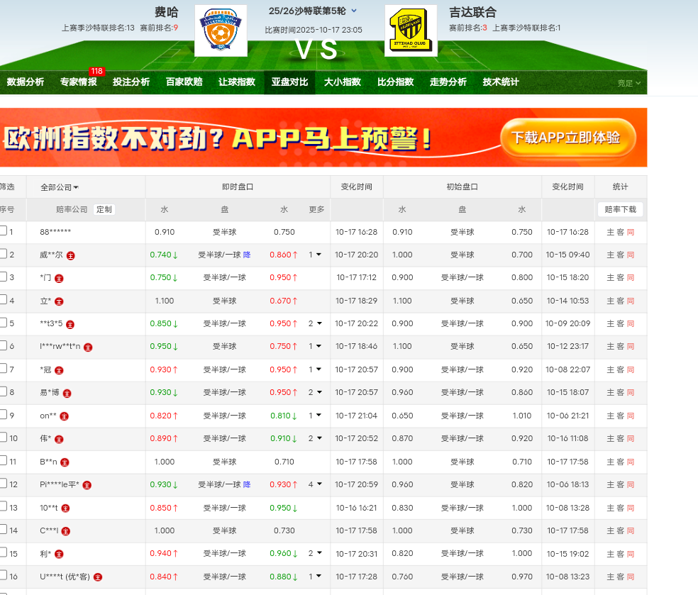 沙特联赛的盘口跟亚冠西亚区差不多,深档特别多,以前偶尔看看利雅得