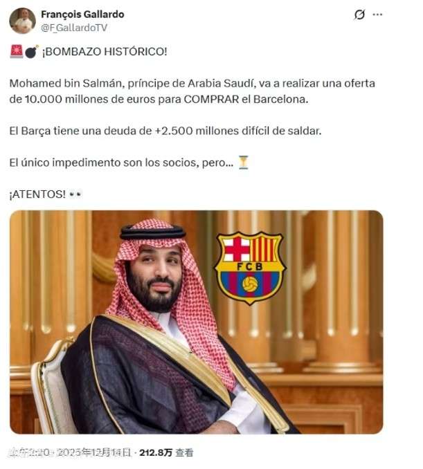 靠谱吗?西媒曝沙特王储有意100亿欧收购巴萨 此前还曝出哈兰德加