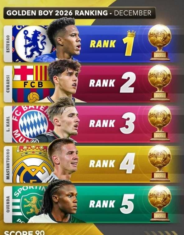 外媒预测2026金童奖排名:切尔西埃斯特旺居首 库巴西&卡尔分列