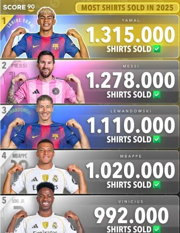 2025球衣销量榜:亚马尔力压梅西居首 C罗位列第七