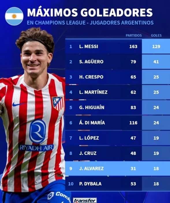 阿根廷欧冠历史射手榜:梅西129球居首 阿尔瓦雷斯18球跻身前九