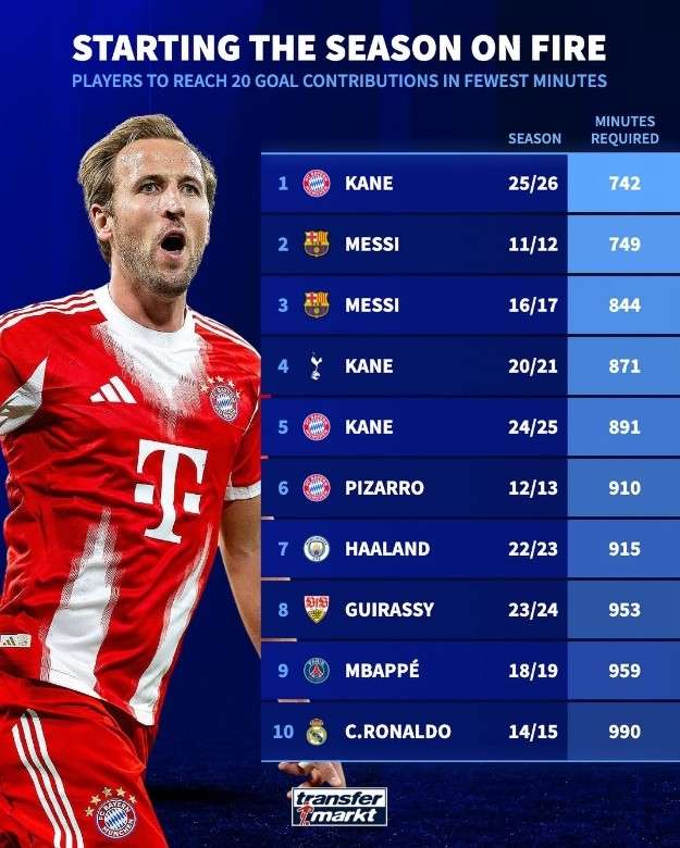 742分钟造20球!凯恩成五大联赛历史最快制造20球的球员