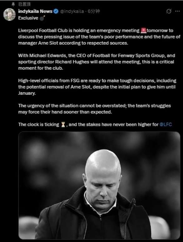 近12场9负!利物浦高层紧急开会+考虑解雇斯洛特,5大新帅候选曝
