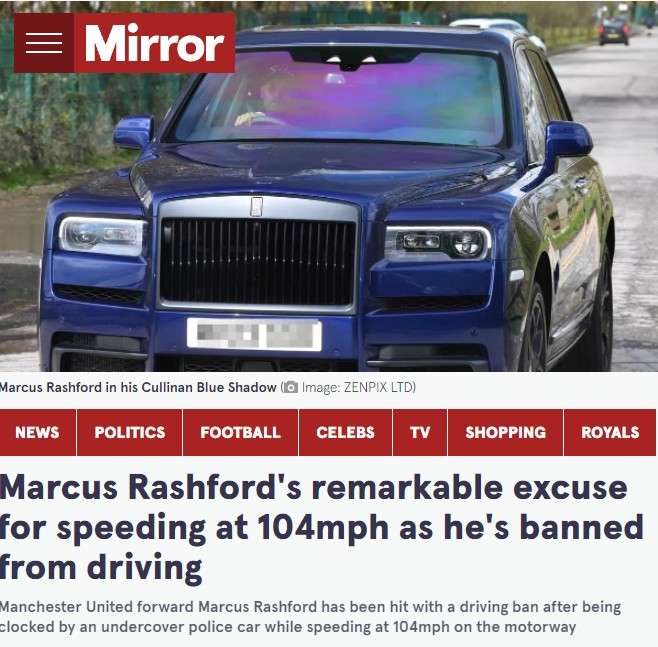 拉什福德驾驶劳斯莱斯超速处罚出炉:禁驾6个月+罚款1666英镑