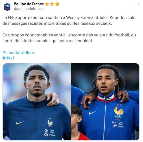 法国队官方力挺福法纳&孔德:这些种族歧视言论违反了足球价值观